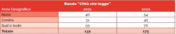 (Fonte: Istanze presentate per area geografica “Città che legge” biennio 2021-2022 - tratta dalla Relazione concernente lo stato di attuazione del Piano Nazionale d’azione biennio 2021 -2022)